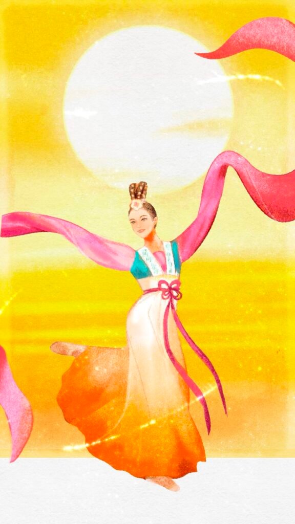 このイラストは、神韻2017年の「漢麗舞長袖」という演目からインスピレーションを得たもの。個人的にすごく印象に残っているプログラムで、舞踊の美しさはもちろん、舞台の裏にある情熱と執念のようなものを強く感じた作品でした。
